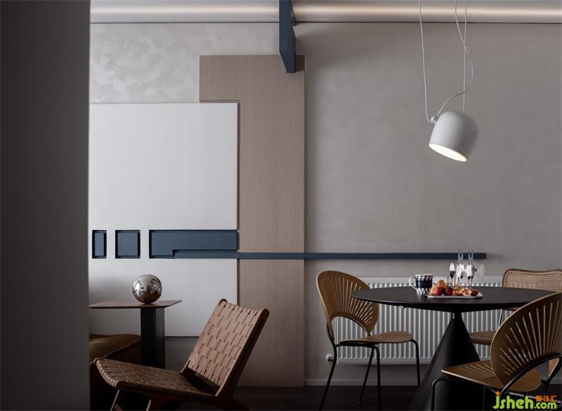 餐廳背景墻與客廳,借墻面穿插的線條創(chuàng)建聯(lián)系。體塊形狀和線條色調(diào)的變化,豐富墻面視覺(jué)內(nèi)容。圓形餐桌搭配線條流暢的貝殼餐椅,調(diào)和直線的冷硬,為用餐空間注入滿滿療愈力。