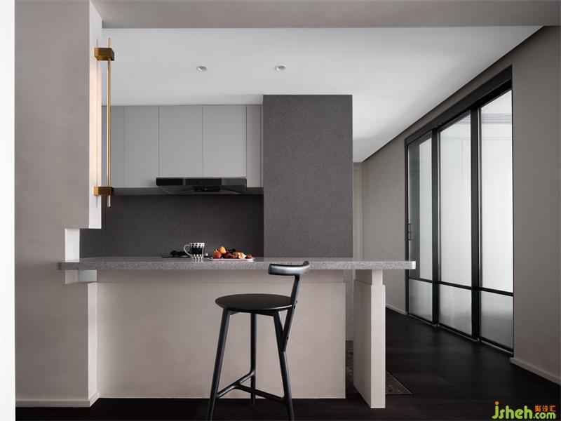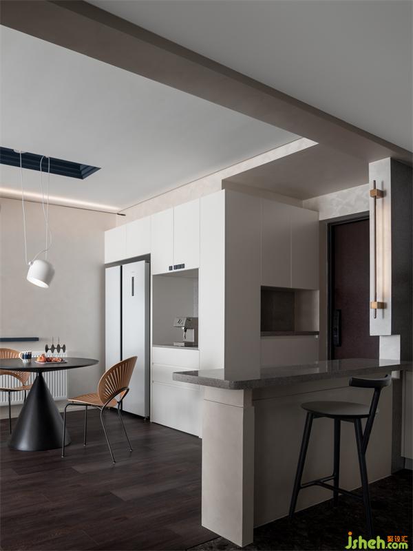 廚房墻面局部拆除,以開(kāi)放形態(tài)展開(kāi)。以玄關(guān)為開(kāi)端設(shè)計(jì)出吧臺(tái),餐后在吧臺(tái)處小酌閑飲,將屋主向往的閑適生活進(jìn)行具象化表達(dá)。