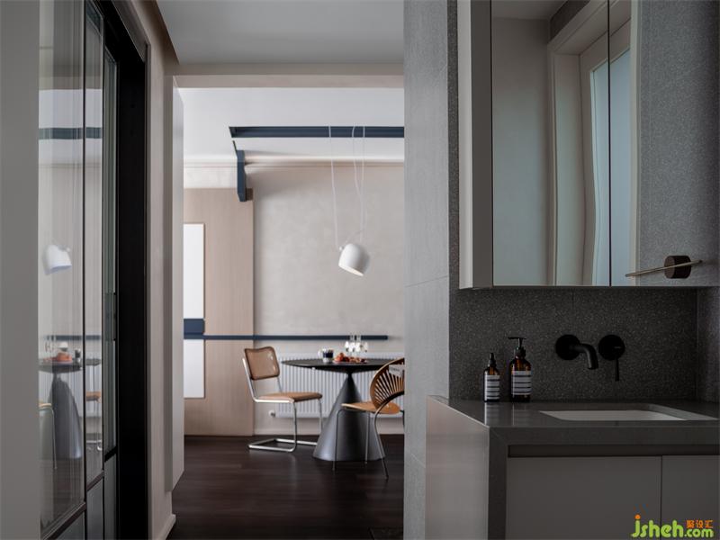衛(wèi)生間干區(qū)分離出來(lái),弱化了狹長(zhǎng)過(guò)道視覺(jué)上的單一。干濕分離的設(shè)計(jì),讓洗漱沐浴更加便捷從容。