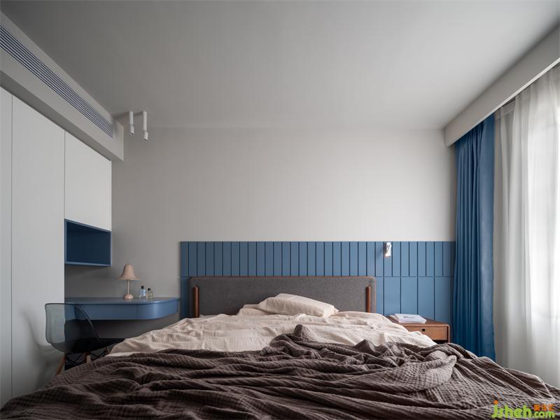 詩(shī)享家設(shè)計(jì)改變主臥開(kāi)門位置,由書(shū)房到臥室更加便捷。臥室背景墻揉入靜謐藍(lán)色,色調(diào)的變化讓臥室氛圍更加柔和。