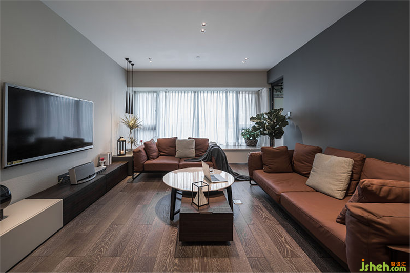 深色背景墻和咖色沙發(fā)的質(zhì)感對比(開燈效果)