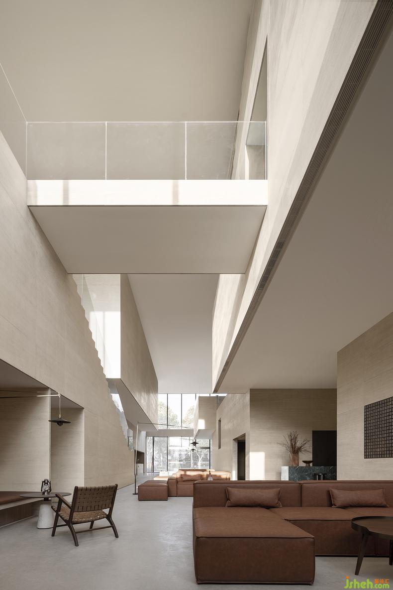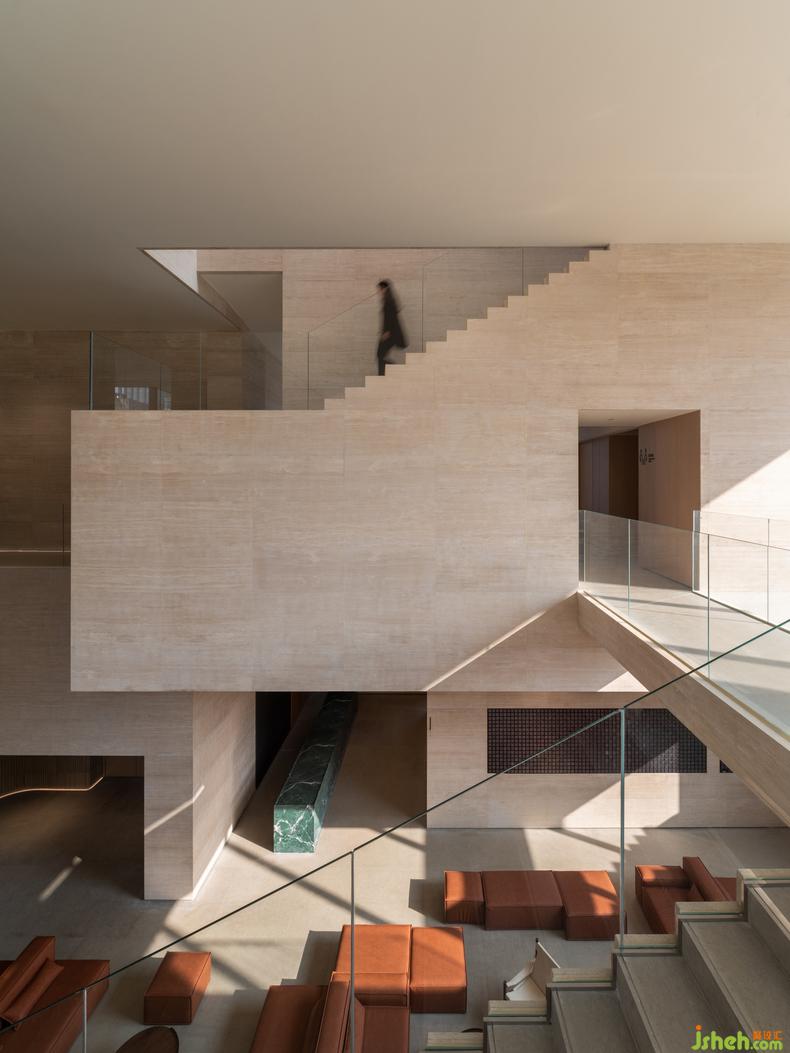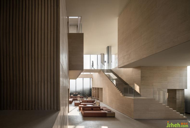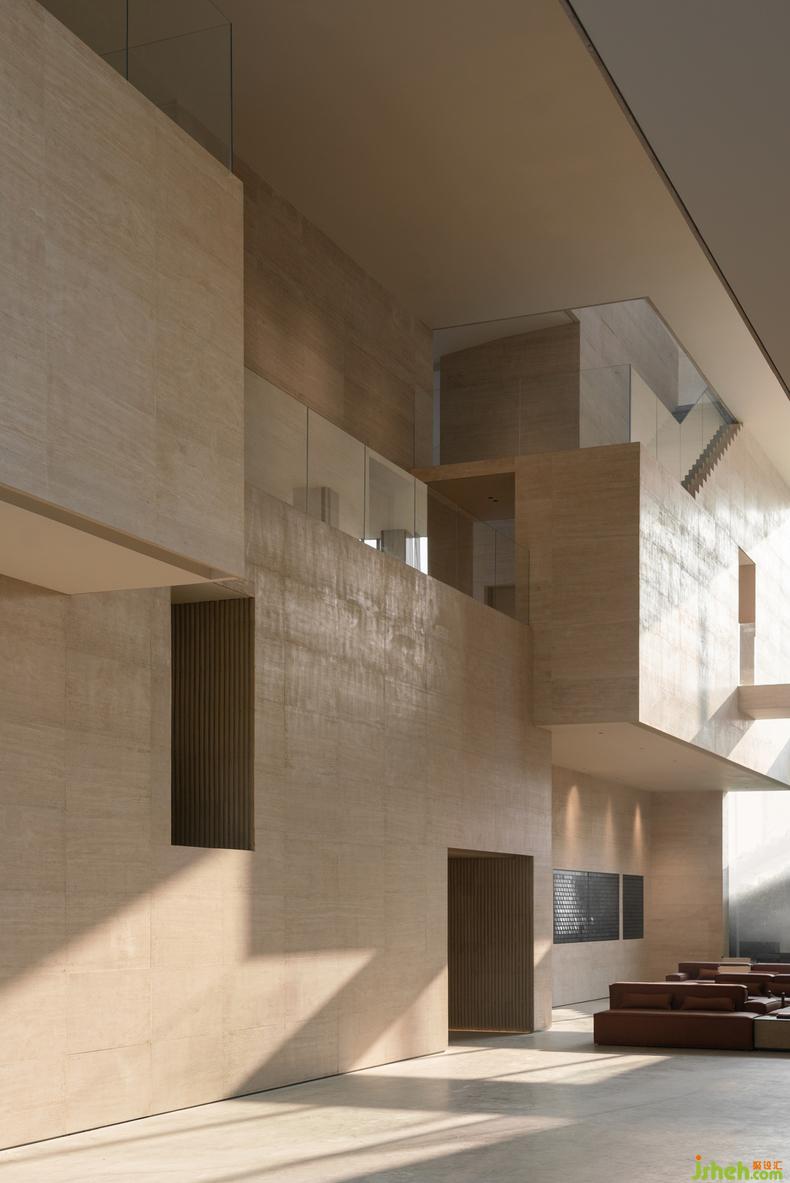 藝術(shù)館設(shè)計(jì)的理念通過(guò)物與物之間的關(guān)系得以表現(xiàn)。二樓深度洽談區(qū)的軟裝設(shè)計(jì)和一樓遙相呼應(yīng),互通有無(wú)。一樣的以磚紅輔以典雅的灰棕色調(diào),極簡(jiǎn)地表述著相同的故事。精妙之處在于,設(shè)計(jì)者為了更能彰顯建筑空間的氣質(zhì),在沙發(fā)的選用上選擇了更建筑材料一樣的石材,再者,從細(xì)節(jié)處以金屬和木飾面作為主要的材料,整個(gè)空間靜謐且高貴。