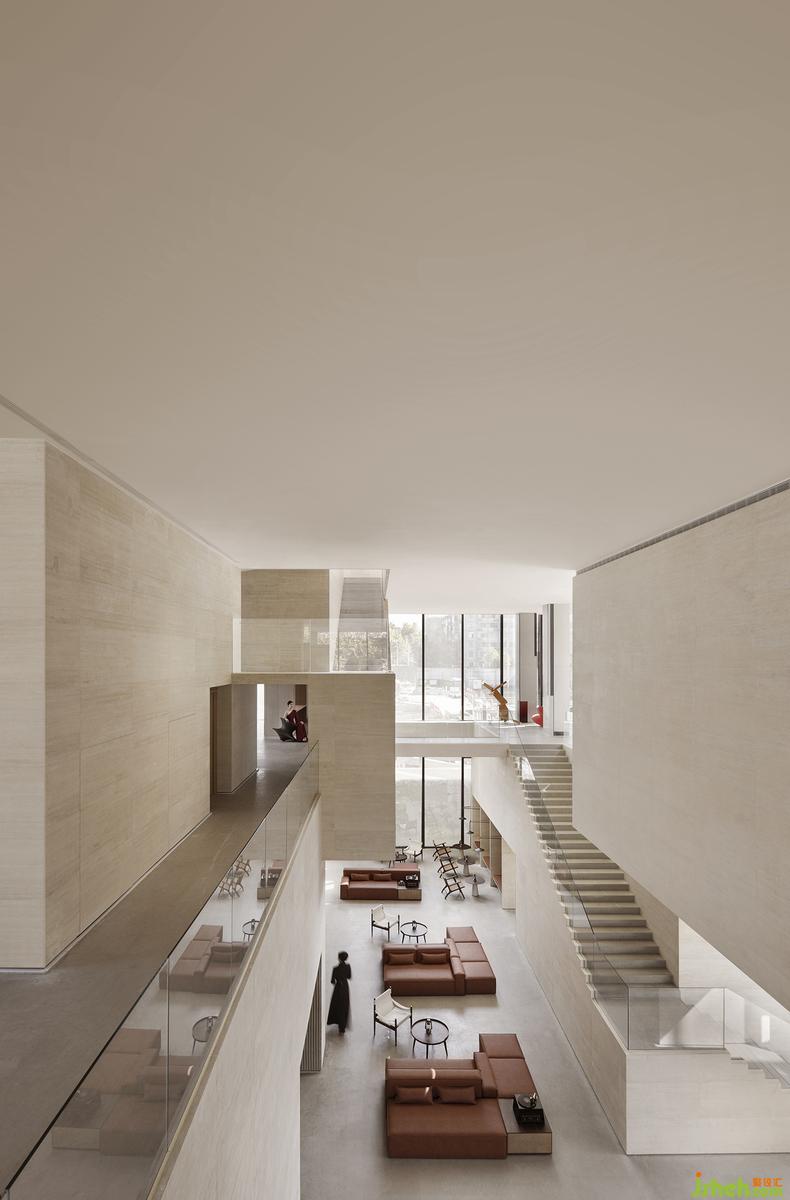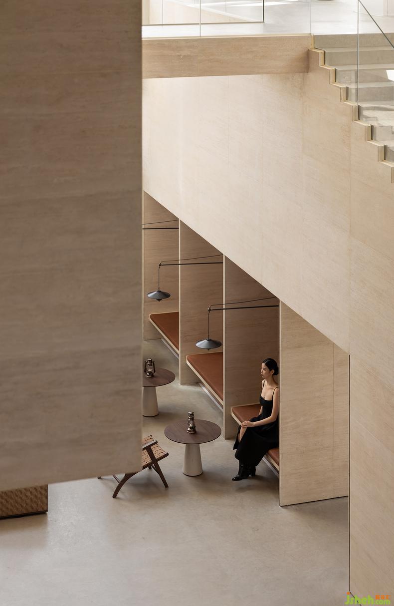 二樓架空的寬闊平臺以階梯作為觀戲座位,眺望對向巨幅墻面投影或任一角落開啟的行為藝術,打破傳統(tǒng)表演/觀賞的靜態(tài)距離,藉由互動互望、演繹回味江灘人文情懷、深化城市靈魂。