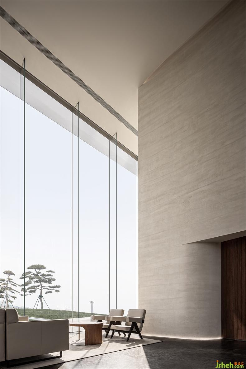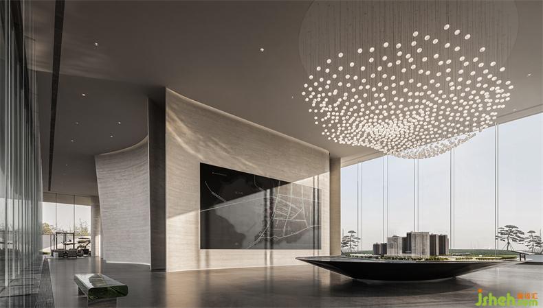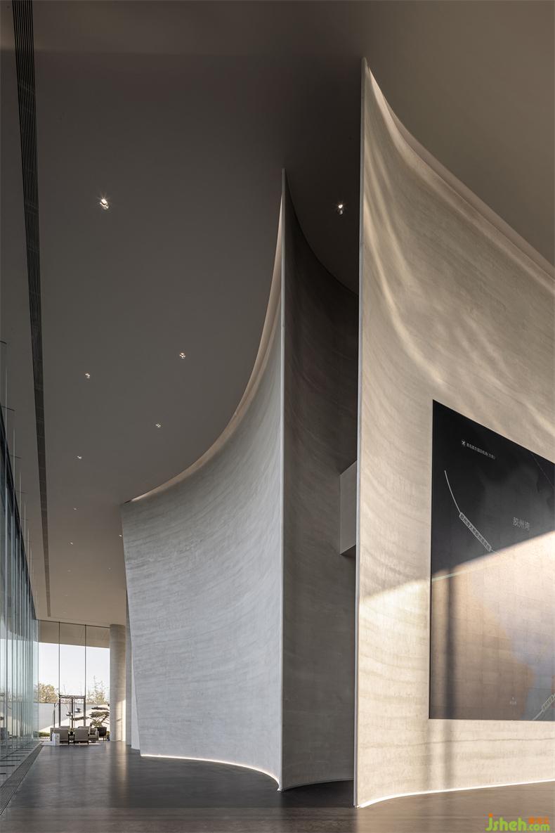 交疊垂直立面兩側(cè)留有臨窗路徑,售樓處設(shè)計(jì)逐漸現(xiàn)身的座位如航行時(shí)望見岸上星火點(diǎn)點(diǎn),旅程中目的地逐漸浮現(xiàn),漸強(qiáng)和聲引起人們對后方樂章的憧憬。