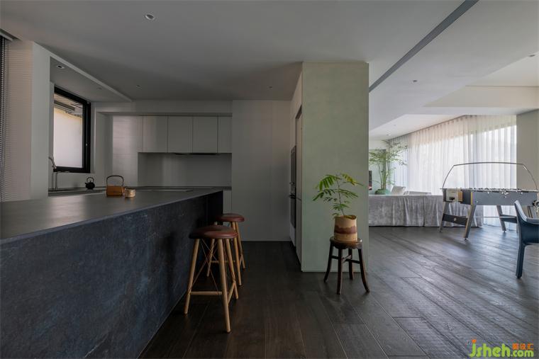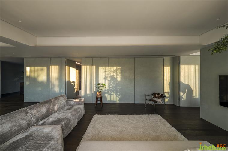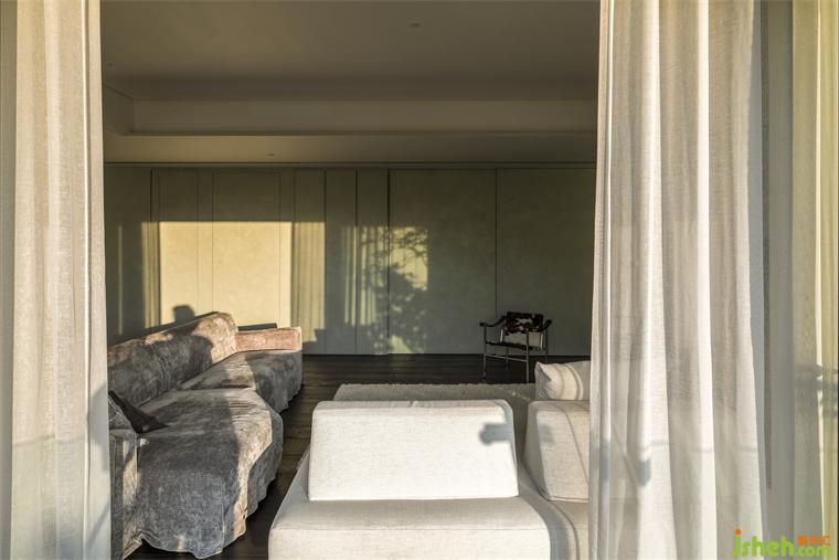 入口一路延伸至主臥的長(zhǎng)軸線空間,住宅設(shè)計(jì)正對(duì)窗景的主墻如一卷沉靜畫(huà)布,我們挑選光澤如玉的「秘色」作主調(diào)。來(lái)自晚唐時(shí)期越窯出產(chǎn)的「秘色瓷」,愛(ài)茶詩(shī)人徐夤曾以「月染春水」、「薄冰盛綠云」詩(shī)句描述,其色類(lèi)玉類(lèi)冰介于白灰、碧綠之間。非直白模擬戶外綠意,而是綜觀真實(shí)環(huán)境、光線與個(gè)人感受揉出詩(shī)意色調(diào),退入霧中的含蓄,軟而綿長(zhǎng)舒展成起居背景,只見(jiàn)樹(shù)影因風(fēng)搖曳。