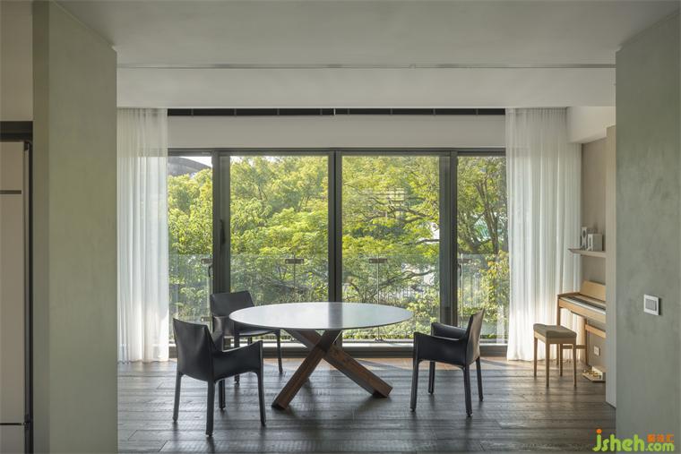 而漆料礦物粒子折射日光的強(qiáng)弱變化,住宅設(shè)計(jì)使早晨清麗如未散的薄霧,翠色漫著一層灰白;當(dāng)夕陽(yáng)直射入室,色溫使墻轉(zhuǎn)為帶著光澤的碧綠;入夜開(kāi)啟照明時(shí),白中帶綠的層次似暖玉,隨視角變換色階,如山色在有與沒(méi)有之間最美。