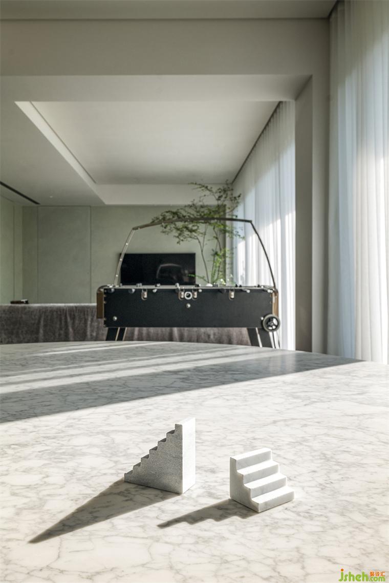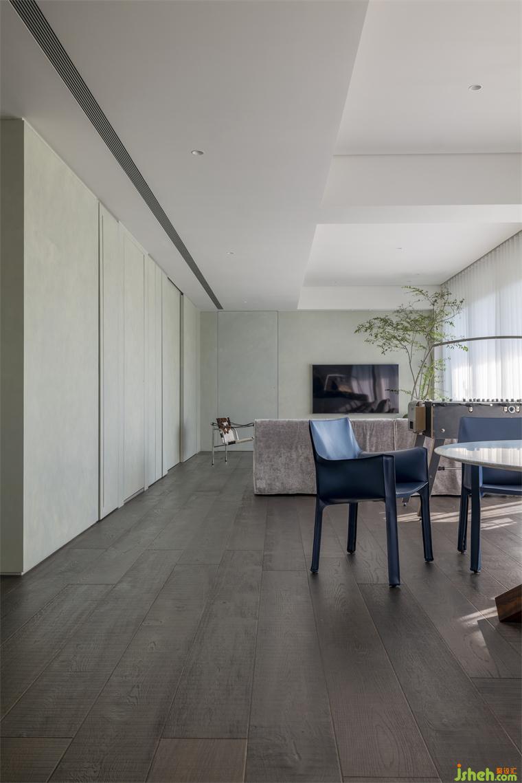 以釉色勻墻,地面便想以水墨襯出場(chǎng)景重量,住宅設(shè)計(jì)因?yàn)槿粢猿R?jiàn)橡木色襯底,重心不足會(huì)使秘色顯得飄忽猶疑,反而以黑棕色為地坪,就如水墨畫(huà)中奠定層次的濃墨,在大尺度畫(huà)紙上穩(wěn)住各個(gè)元素的定位。且相較于淺色木質(zhì),夕陽(yáng)映入室內(nèi)時(shí),黑棕色地面更能襯出明暗節(jié)奏,在沈定的軸線上悠悠晾著光影。