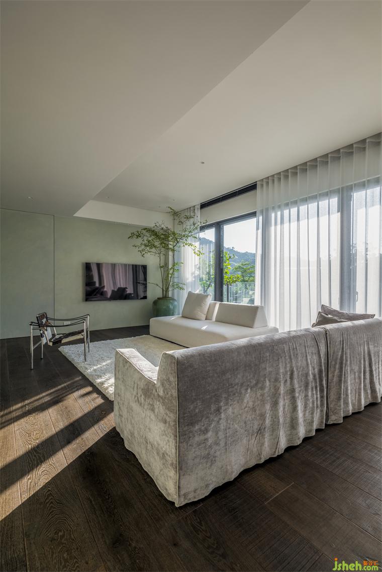 為強(qiáng)調(diào)窗景和動(dòng)線流暢,我們拉大落地窗跨距,住宅設(shè)計(jì)規(guī)劃格局也避免墻體垂直接觸、切斷窗的連貫性,帶狀露臺(tái)也在外形成另一串連起居的小徑,微風(fēng)能隨生活在此間游走。主臥床頭與更衣室隔間墻變與窗脫開(kāi)距離,綠意和晨昏光景能延續(xù)、穿梭。主臥浴室同樣不以隔墻柜體阻斷采光,但基于隱私更換為雕刻玻璃,梳洗之余仍可感受個(gè)人與自然相連。