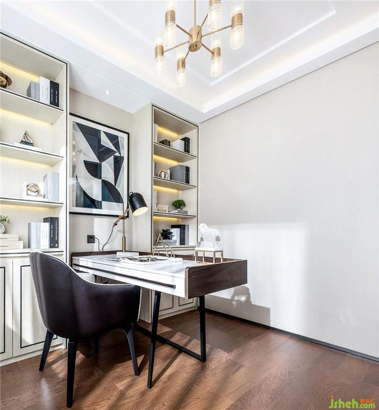 書(shū)房無(wú)過(guò)多的裝飾,戶外光線與白色墻壁,增強(qiáng)空間的亮度。