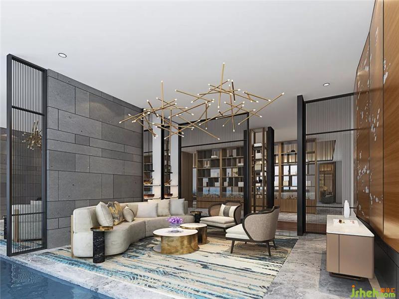 前臺接待區(qū)墻面、地面皆采用高級灰大理石。天花沒有復(fù)雜的造型,強(qiáng)調(diào)線形流動的變化,流暢幾筆,隨光與影的改變而賦予美感。