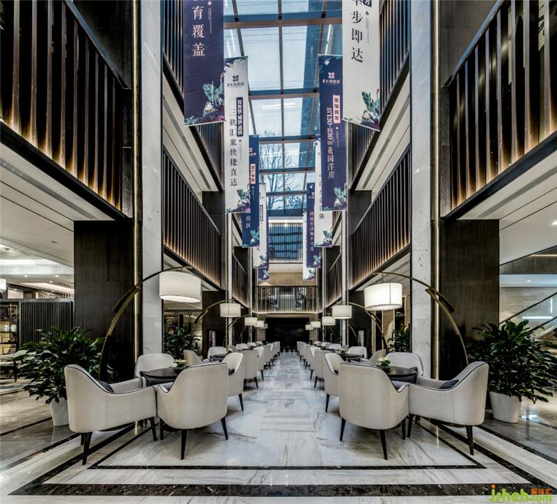 接待廳十多米長的吊燈,以菠蘿珠毯的形式疊加而成,似花瓣、也似天空云朵??臻g更加敞亮,色彩與材質(zhì)高度的契合,詮釋了對空間意境的定位。