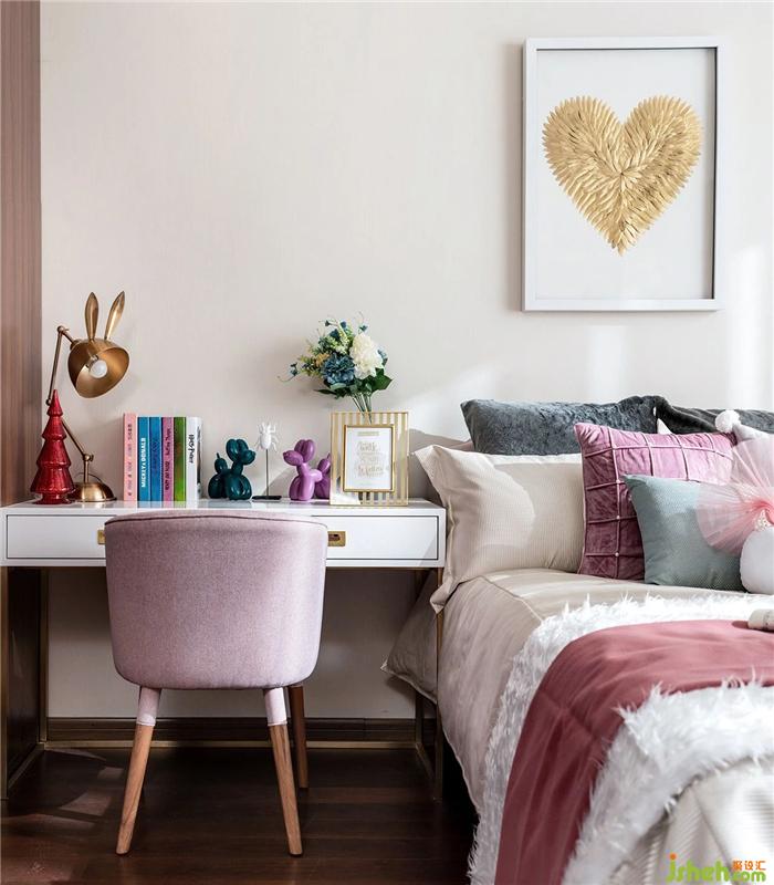In the colorful rhythm, through the echo of the pink and blue lines, the room exudes a relaxed and lively childlike interest...