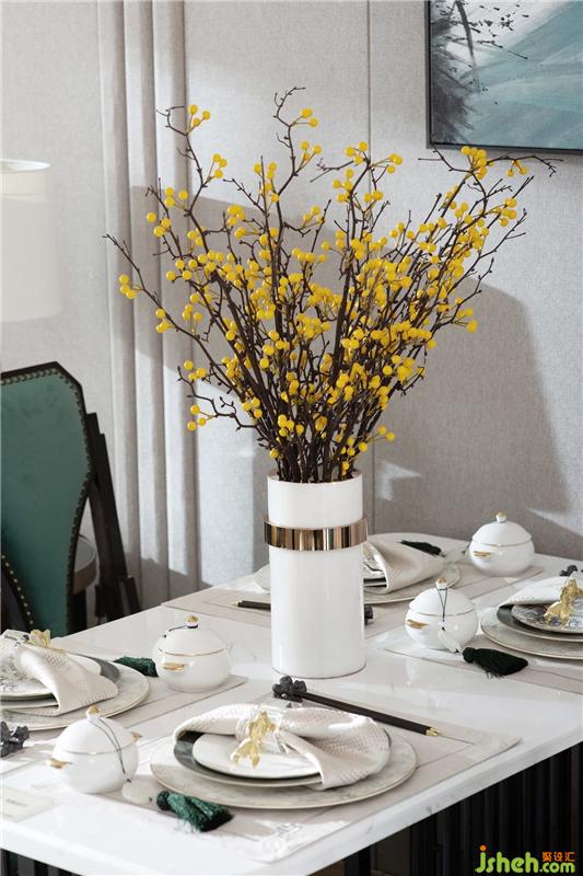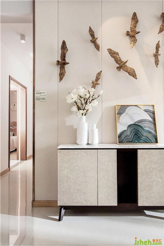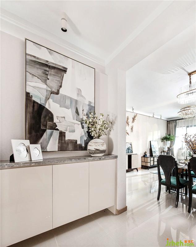Chinese-style symmetrical display, modern and concise and material conversion processing. The combination of jewelry, painting and fabric enhances the expression of meaning in their respective spaces.