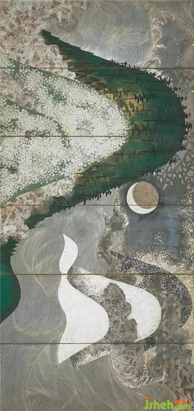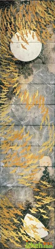 加山又造的著名作品《千羽鶴》在構(gòu)圖上取長橫式,左右有較大的日與月的意象,背景是一種翻涌的浪紋,恍然是海浪,結(jié)合日月意象,放佛又是處于天上的銀河中,在這種朦朧的,動(dòng)蕩的漩渦暗涌的背景下,成群的鶴影有序成隊(duì)的飛行,被畫者組織得很有節(jié)奏感。在藝術(shù)手法上,增添了一些現(xiàn)代感,簡明與細(xì)致結(jié)合,細(xì)謹(jǐn)而明晰。