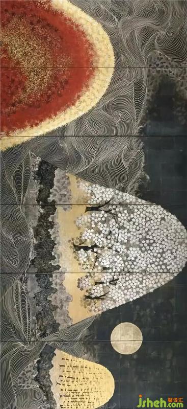 Jiashan’s famous work “Thousand Feather Cranes” takes a long horizontal style on the composition, and there is a large image of the sun and the moon. The background is a kind of undulating wave pattern, which is like a wave, combined with the image of the sun and the moon. In the galaxy of the sky, in the background of such awkward, turbulent whirlpools, groups of cranes fly in an orderly manner, and the painters organize a rhythm. In terms of artistic techniques, it adds some modernity, concise and meticulous combination, careful and clear.