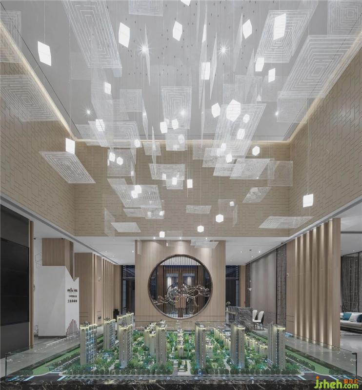 沙盤區(qū)一組大型白色藝術(shù)裝置吊燈映入眼簾,亞克力片裝置形成虛實(shí)相間的韻律感,喚醒空間的靈魂,尤其在墻壁棕色木質(zhì)材料的襯托下顯得格外明朗有力,形成強(qiáng)烈的反差與對比。無論從光影,顏色還是材質(zhì),都在著力營造一種空間的延伸,既相互依托又各有千秋。會所設(shè)計
