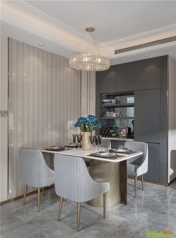 餐桌花藝以及餐具點綴寶石藍(lán),與主題相呼應(yīng)。以豐饒的創(chuàng)意表達(dá)生活內(nèi)涵和當(dāng)代氣質(zhì),將空間具化為實用與美學(xué)交織相融的生命體,賦予空間輕奢、雅致而舒適的生活氛圍。