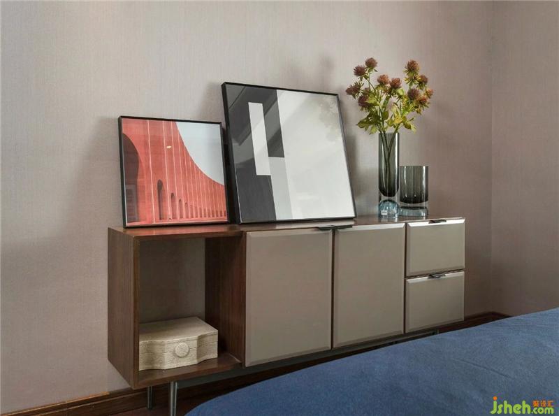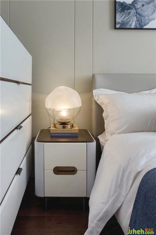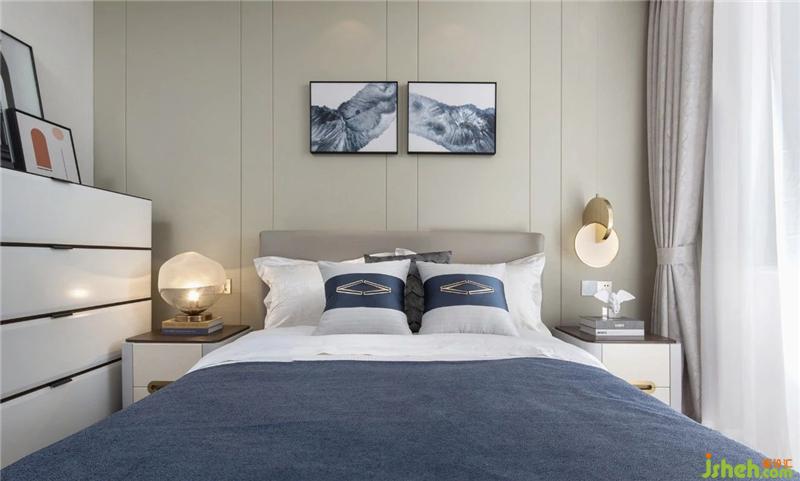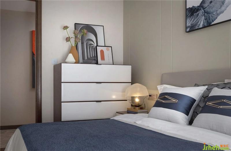 The cool-colored bedding of the second bedroom is matched with the wall and the hanging picture. The milky white cabinet has a brown decorative strip, and the warm color of the light source will not appear abrupt.