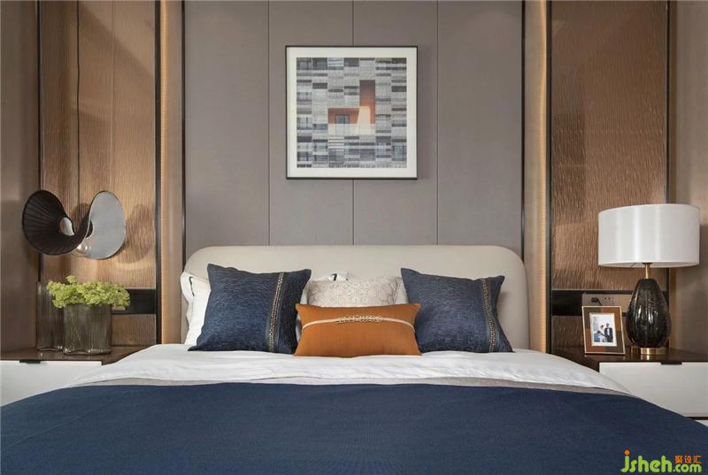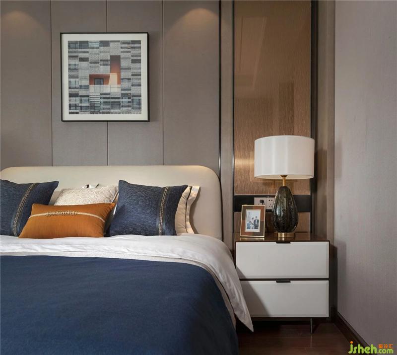 次臥的冷色床品與墻面、掛畫相搭配,乳白色柜體有了棕色的裝飾條,光源的暖色也不會(huì)顯得突兀。