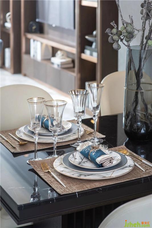 The restaurant continues the color tone of the living room space, the leather dining chair and the marble dining table, the sense of honor is just right, not heavy and oppressive, on the contrary, it shows the life and aesthetic taste of fashion and modern city.