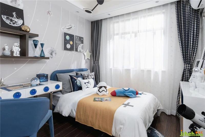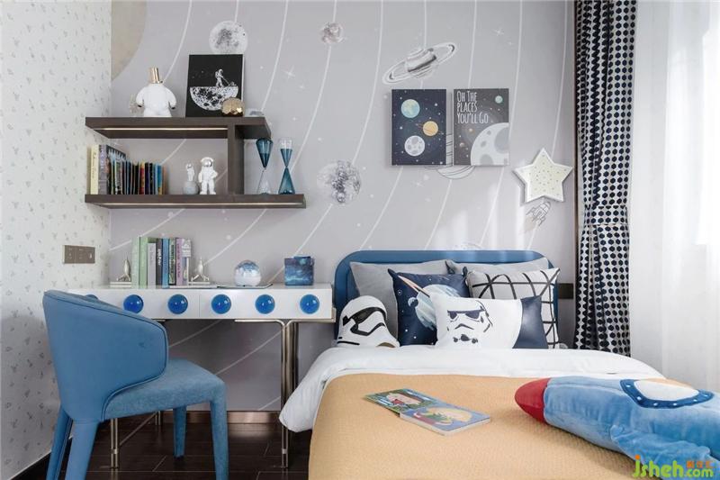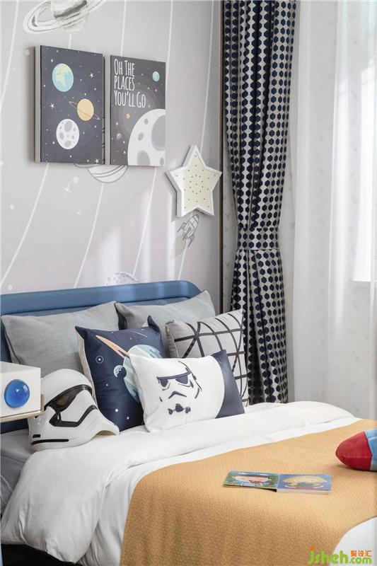 In the boys' room, we chose a relatively high saturation of yellow and blue, in line with the boy's lively personality, according to his curiosity in outer space, to create a "swimming earth" theme of children's space space.
