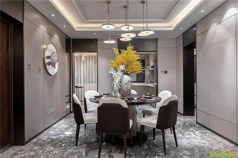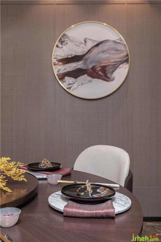 餐廳內(nèi)的山水裝飾與客廳相呼應(yīng),讓膳飲變得生趣盎然:遠(yuǎn)處的山巒疊影,邈遠(yuǎn)寧靜; 近處的水波流淌,仿若泛舟湖上。山水之間,生活的浮躁消失一空。The landscape decoration in the restaurant echoes the living room, making the dining drink interesting: the distant mountains and the shadows are far and quiet; the water waves in the vicinity are like a boating lake. Between the mountains and rivers, the impetuous life disappeared.