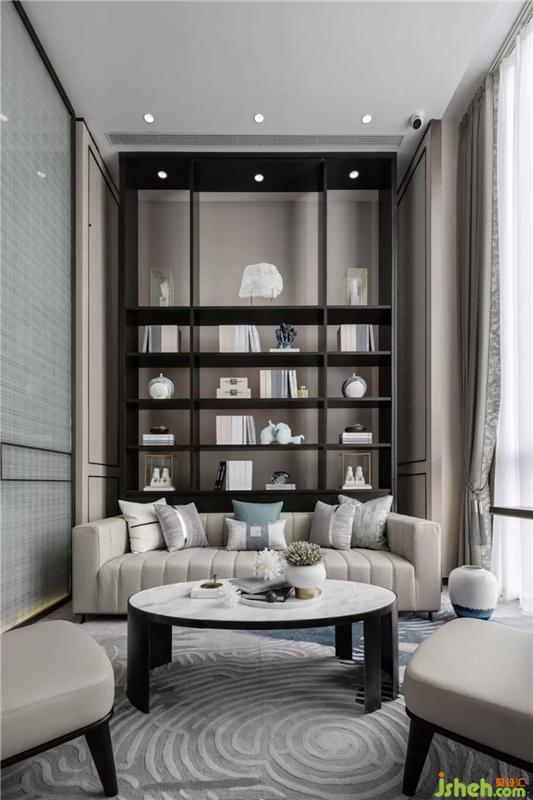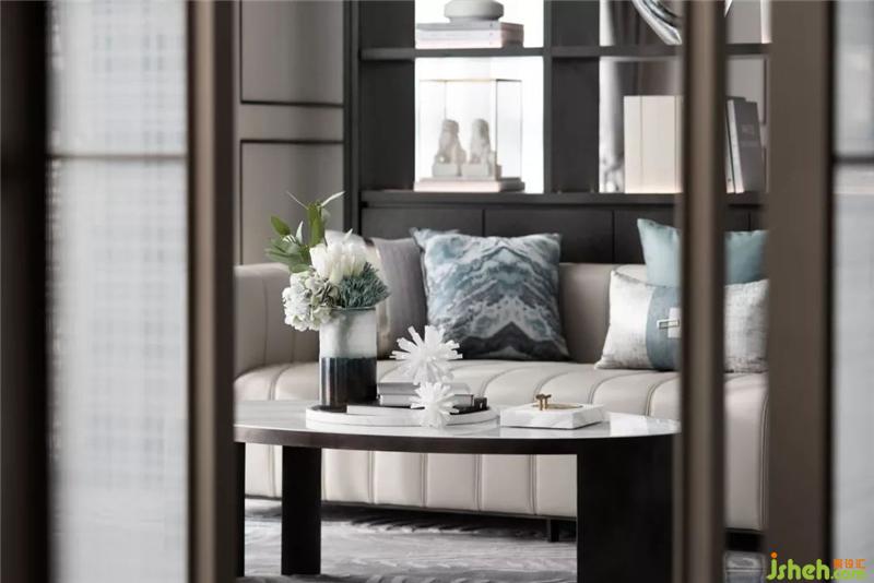 家具的設(shè)計與制造由傳統(tǒng)和現(xiàn)代的材質(zhì)相結(jié)合,低調(diào)的銅質(zhì)金屬在地毯水藍色曲線的呼吸中喚醒了空間的精致感與層次感。裝修設(shè)計