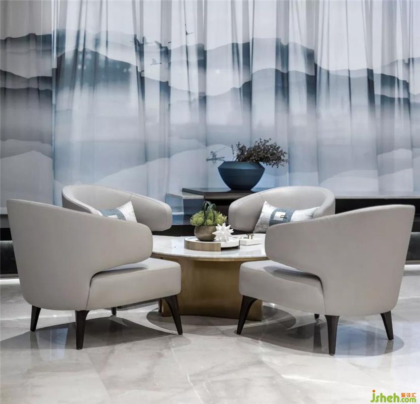 Luxury is another way of space design. The combination of traditional and modern materials of furniture modeling and copper metal awakens the delicate appearance of space in the breath of carpet water blue curve.