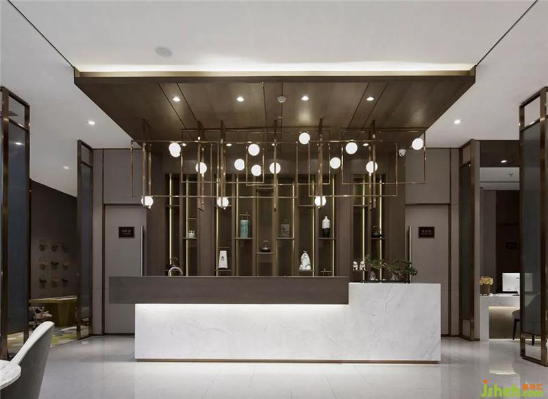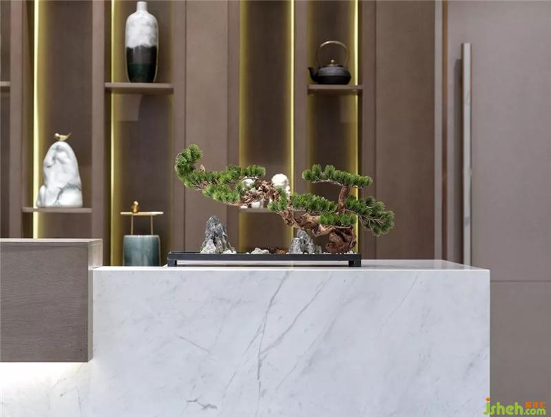 水吧區(qū)裝飾效果給人一種精致典雅的復(fù)古感,帶有灰色印花的大理石臺面增添了整個空間簡約大氣的精致美感,讓人印象深刻。室內(nèi)設(shè)計師