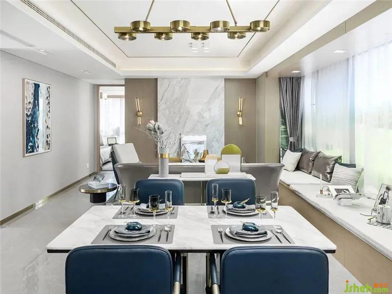 該戶型在色彩上以金屬的黃色系和淺灰色系為基調(diào),加入灰但不失亮的藍(lán)色系,絲絲漣漪又不失家的溫暖,同時(shí)契合杭州湖水的藍(lán)和夕陽的黃。樣板房設(shè)計(jì)