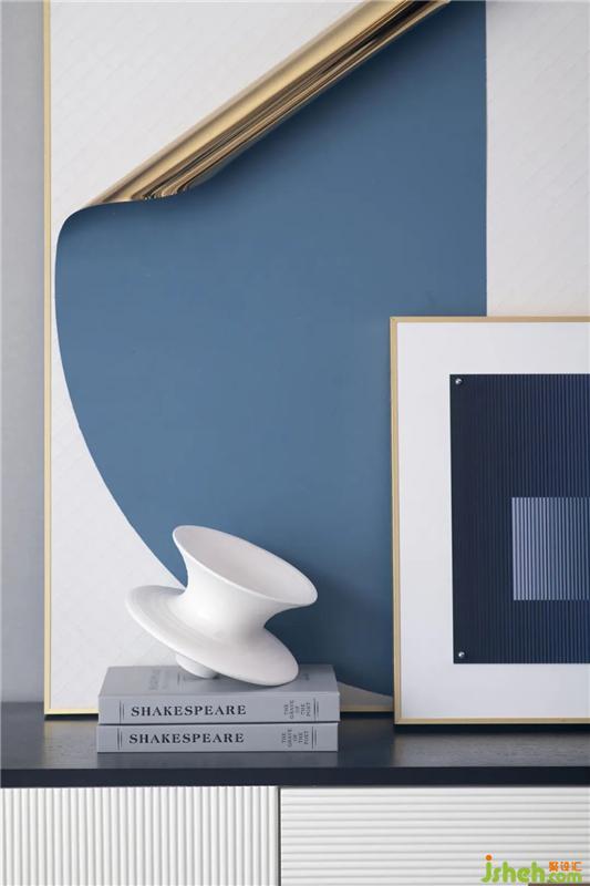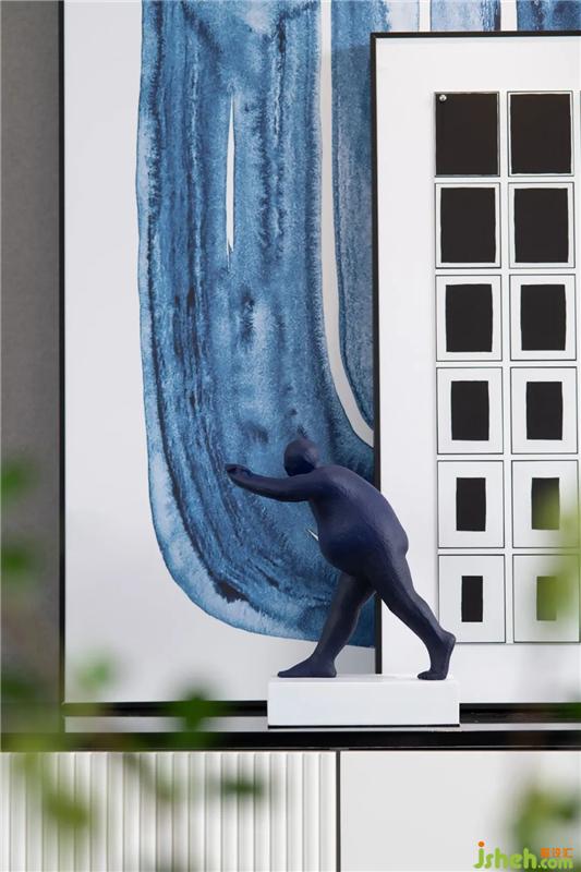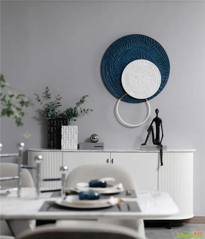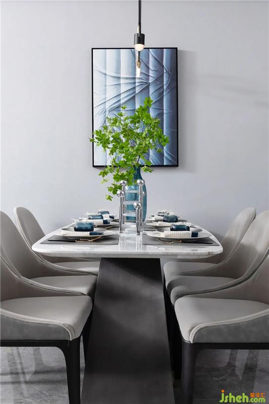 餐廳的四人位采用拼色的設(shè)計(jì),在統(tǒng)一中尋求變化,裝飾畫選擇了面料褶皺的藝術(shù)處理,色調(diào)與花藝,餐椅整個(gè)的色彩相呼應(yīng),營(yíng)造出居家用餐時(shí)刻的和諧氛圍。戶型針對(duì)的是40歲左右的客戶群體,定位為冷色調(diào)的精英家庭,現(xiàn)代輕奢風(fēng)格,強(qiáng)調(diào)雅居生活。
