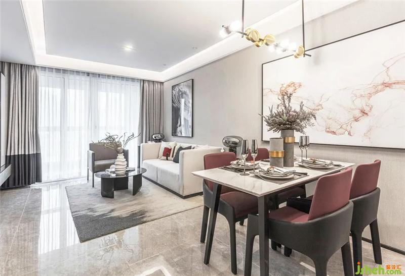 客廳的家具造型簡潔干練,主色調(diào)黑白灰點綴一抹灰紅,不失現(xiàn)代都市時尚感。清晨或午后慵懶的臥在沙發(fā)上,陽光透過玻璃灑下,為客廳投入?yún)⒉畎唏g的光影,靜影成壁,是那么令人沉醉。樣板房設(shè)計