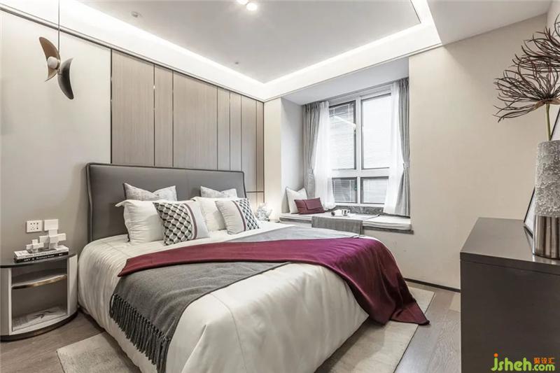 臥室與客廳保持一致的高級灰色調(diào),溫暖而舒服的大床,時尚造型的吊燈和臺燈相互對比,一高一低滿足了起居日常的各種映照需求。樣板房設(shè)計