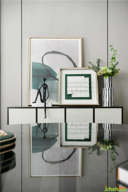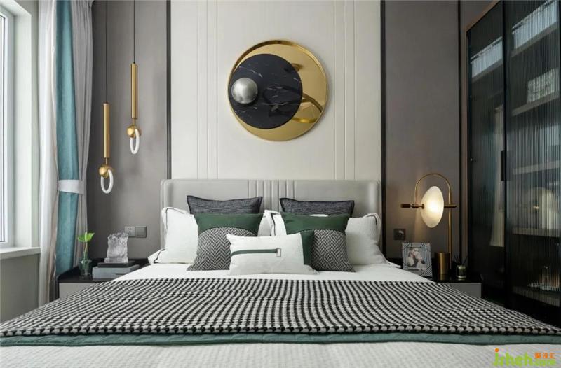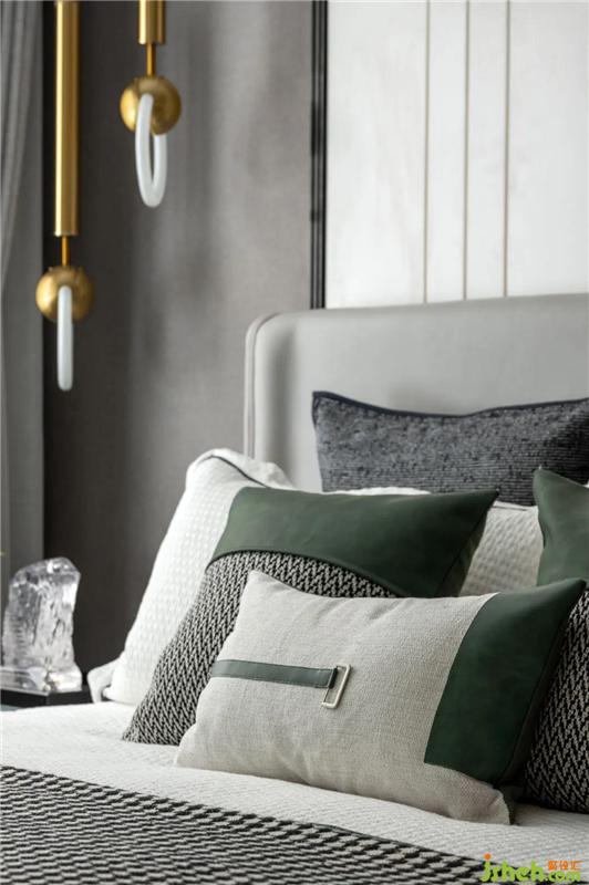 主臥以簡潔的線條分割空間,色彩有著明快的間奏,綠色與高級灰的經(jīng)典搭配,點綴著富有質(zhì)感的金色,色調(diào)溫和而富有肌理,映襯一絲低調(diào)的涵雅,帶柔美,舒適在前,奢華在后。