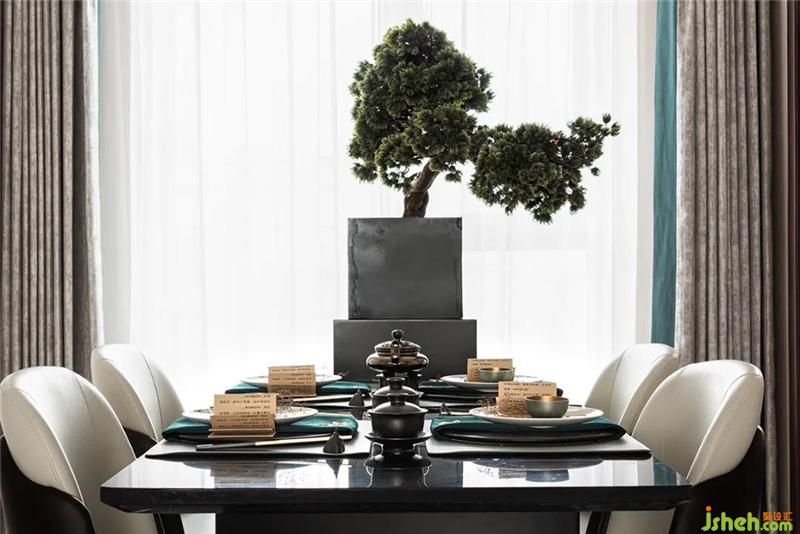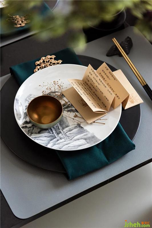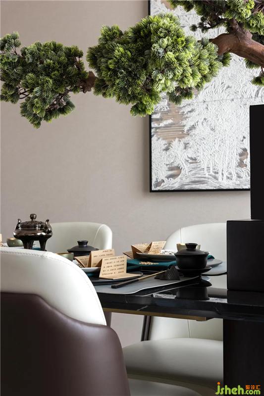 餐廳將東方質(zhì)樸的經(jīng)典古韻味還原,山與松、綠與白、金屬與質(zhì)感,整個畫面疏密有致,保留了通透大氣的空間感,將“用餐”深化到一個新的高度。新中式之所以大受歡迎,大概就是因為它在傳承經(jīng)典的基礎(chǔ)上,又用現(xiàn)代手法進行了融合與創(chuàng)新。