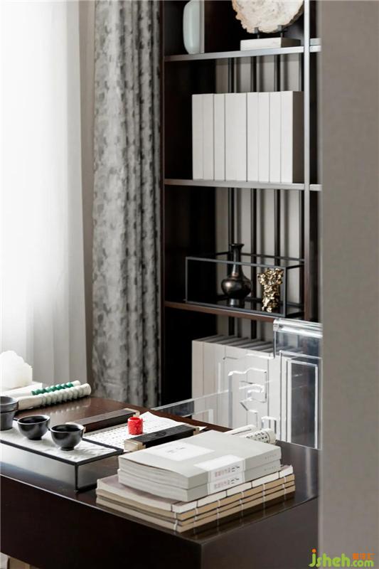 書房以筆法為主導(dǎo),充分發(fā)揮墨法的功能。營造端莊素雅,使人凝神靜氣的空間氛圍,非常適合身處快節(jié)奏的現(xiàn)代都市人。