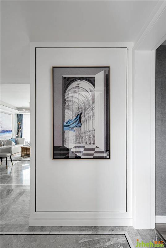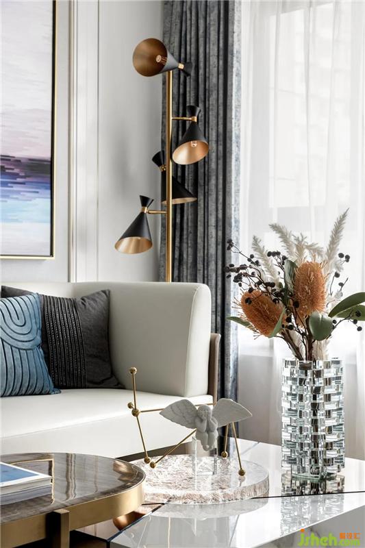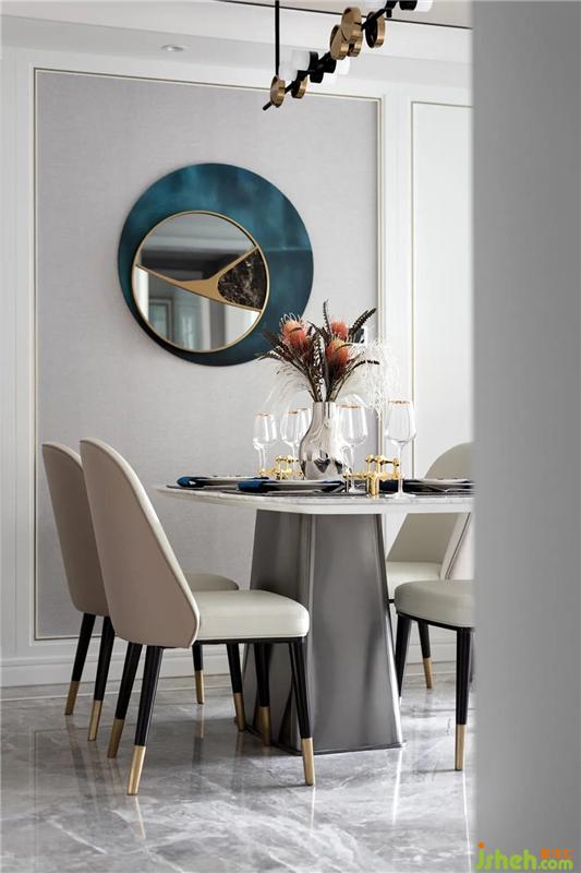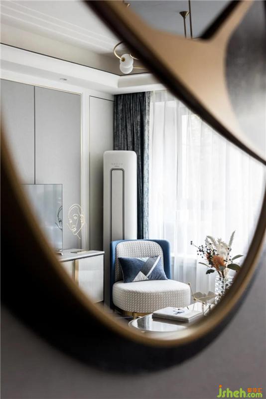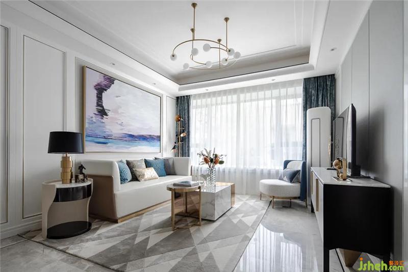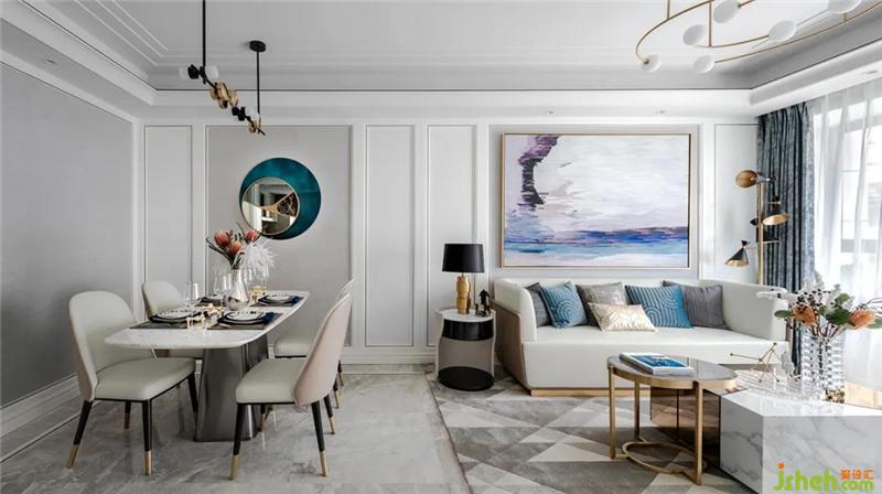 空間延續(xù)了硬裝的暖灰色,現(xiàn)代簡約白色的護(hù)墻板,室內(nèi)設(shè)計(jì)師選擇了灰色大理石地面和米色電視背景墻,讓整個空間更加優(yōu)雅、硬朗、大氣,營造現(xiàn)代奢華感。