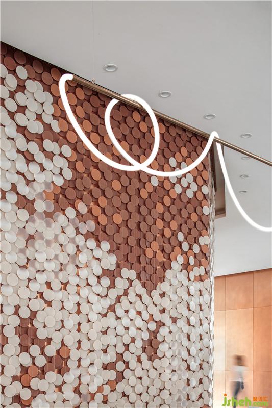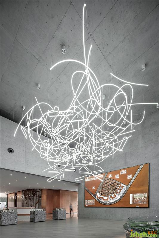 在簡單的幾何體中,光能創(chuàng)造復(fù)雜的空間,“園雖別內(nèi)外,得景則無拘遠(yuǎn)近”,建筑內(nèi)外對仗式布局的藝術(shù)雕塑,穿過澄明的落地玻璃,將水之潺潺抽象為室內(nèi)外空間的對話。售樓處設(shè)計(jì)