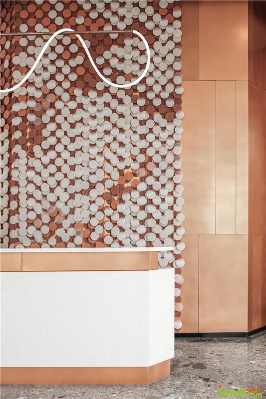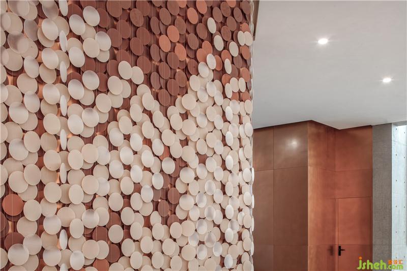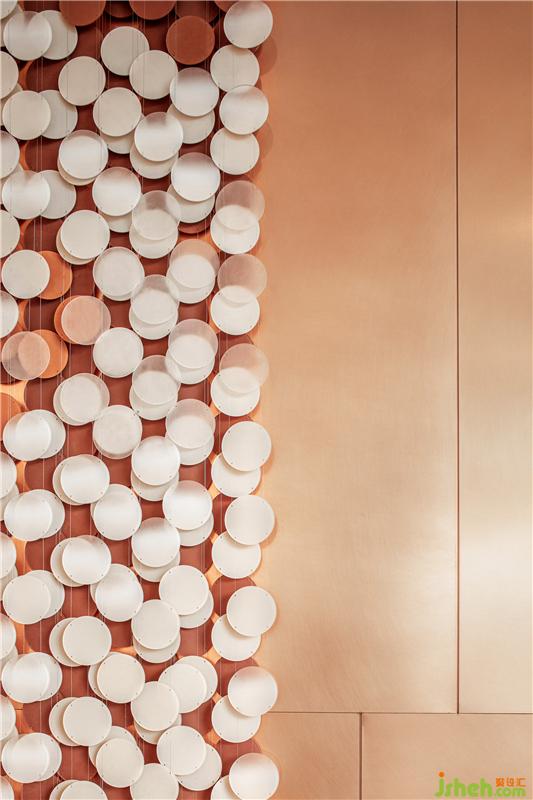 色彩同樣拿捏冷暖的恰當(dāng)比例,在混凝土的冷調(diào)中加入琥珀色柔和暖調(diào)。軟裝設(shè)計(jì)借鑒了玻璃器皿中經(jīng)典的琥珀成色,捕捉光源穿透的微妙藝術(shù)效果。