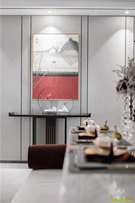 餐具、飾品結(jié)合整體風(fēng)格及空間氛圍,在自然光線與室內(nèi)燈光的點(diǎn)綴之下,更突顯品質(zhì)感,新中式格調(diào)的味道彌散在每一處細(xì)節(jié)。胡桃木與磚紅色搭配的端景臺(tái)點(diǎn)綴在入門盡頭,精美的畫作、氣韻生動(dòng)的倒流香擺件,整個(gè)空間更突顯悠韻綿長之感。