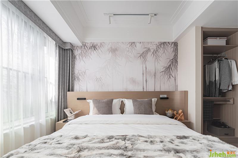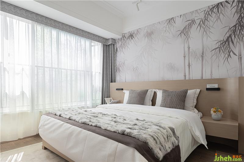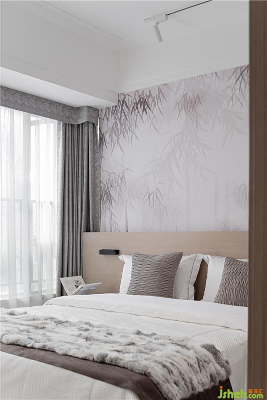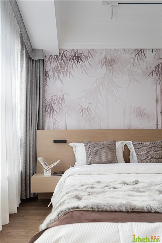 素凈雅致的床品契合樸實(shí)靜謐的竹林背景墻