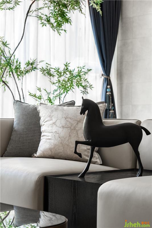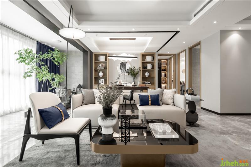 靛藍低飽和度的色調,淡雅而不失活力大氣,有著極舒適的色彩視感,是營造舒緩氛圍居室空間的絕佳色彩。寧靜的格局觀感總是能輕易撫慰人們內心的焦躁,營造一方清爽靈動的自由天地。新中式的家具和高品質的材質,營造一個藝術、舒適、精致的生活空間。