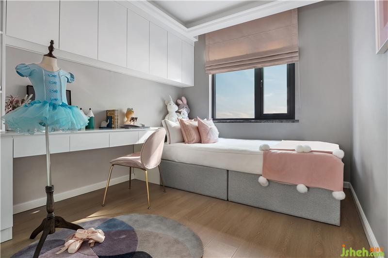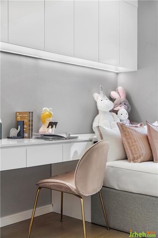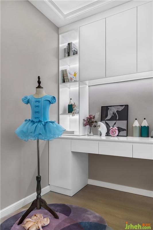 Linda將女兒房裝扮成柔軟的粉藍粉紅色調(diào),裝點著女兒房的甜美與浪漫。Alice喜歡芭蕾,也喜歡小動物,白色書桌與粉色床品的搭配,簡潔雅致,芭蕾舞鞋承載著Alice的公主夢,空間加入童趣的藝術(shù)擺件,讓童夢充滿靈性與趣味。