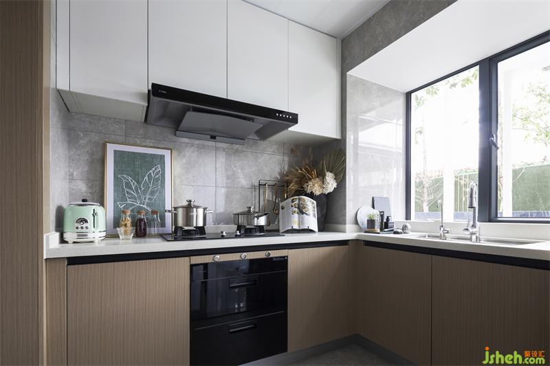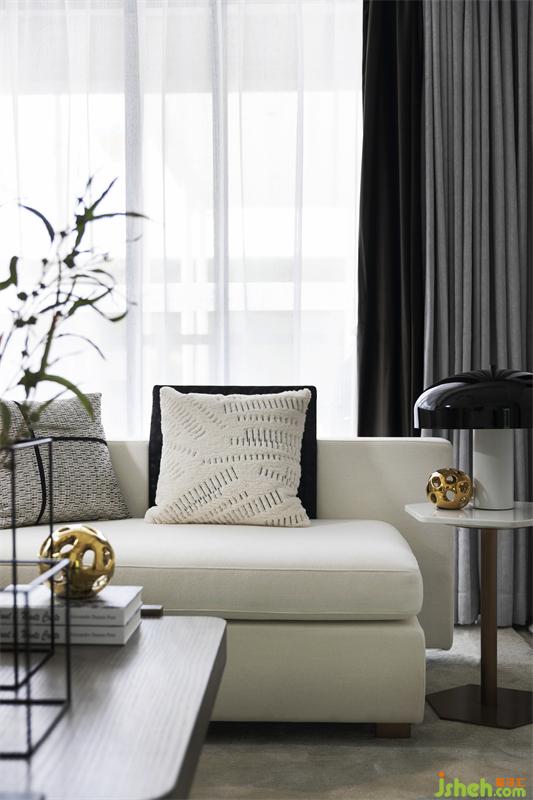 客廳通過開放的空間設計與舒適的材料,營造輕松、精致又不失格調(diào)的氛圍。黑白灰為基礎色,點綴了幾處“垂楊幾處綠煙濃”的“綠煙”色(綠煙是指初春的楊柳泛出的如煙一般的綠色),既保留了綠色的生機又給人以平靜的感覺,使空間獨具韻味。