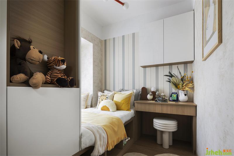 兒童房充滿童趣童真,契合整體空間的暖黃色床品和各式玩具,讓整個(gè)簡約的風(fēng)格里加入了一絲俏皮,仿佛走進(jìn)了夢幻的童話世界。