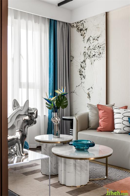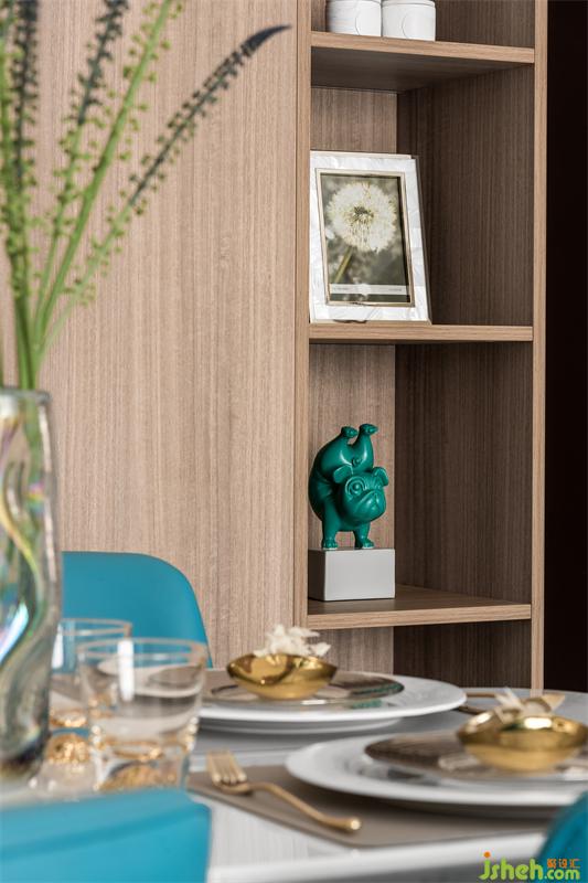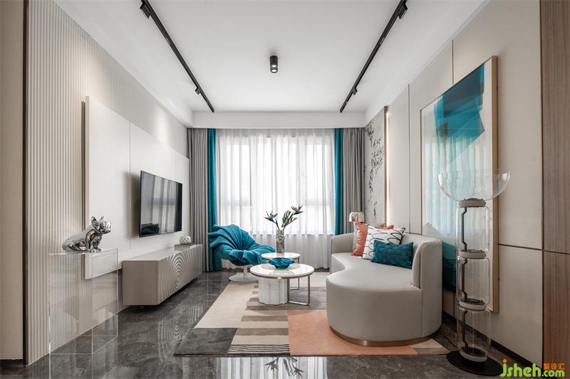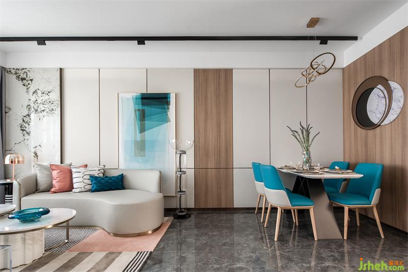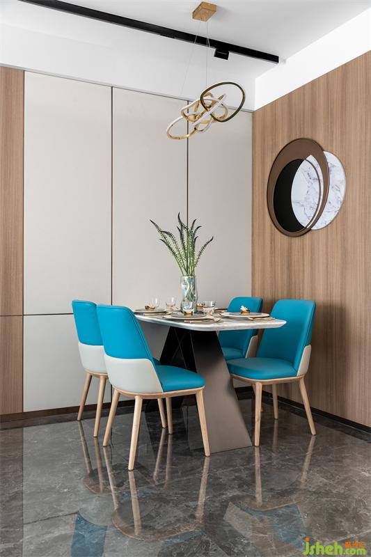 高調(diào)的湖藍色給人年輕、活潑和浪漫的感官體驗 ,暖色空間融合些湖藍色顯得溫馨又極具張力,空間收納萬千寫意。用色彩的純度傳遞個性的符號,視覺上張揚且不失格調(diào),我們通過對線條與色塊的巧妙應(yīng)用營造出舒適、自然、藝術(shù)的空間感受。