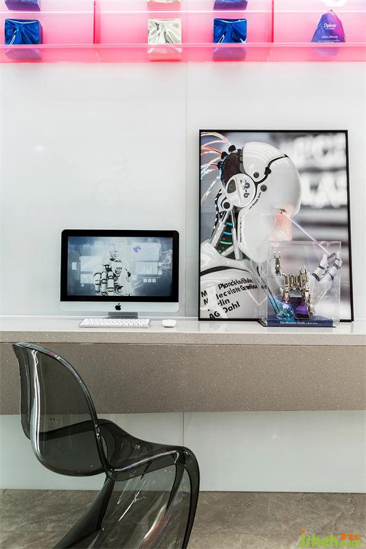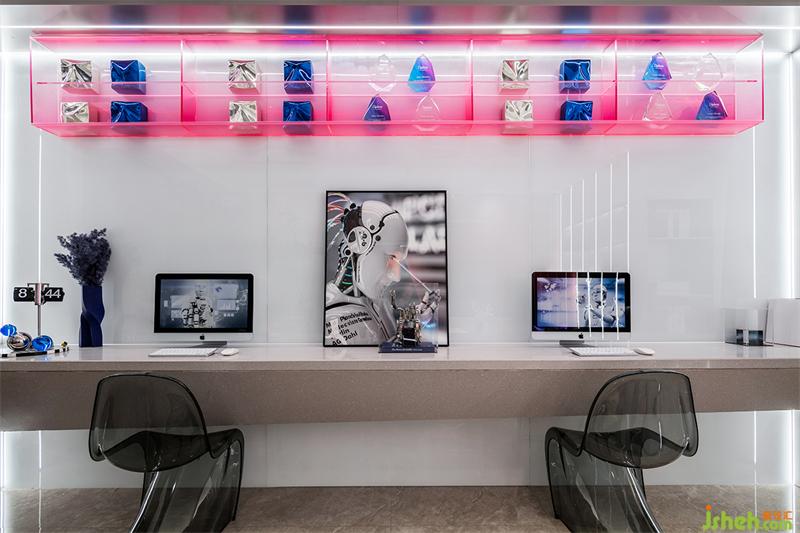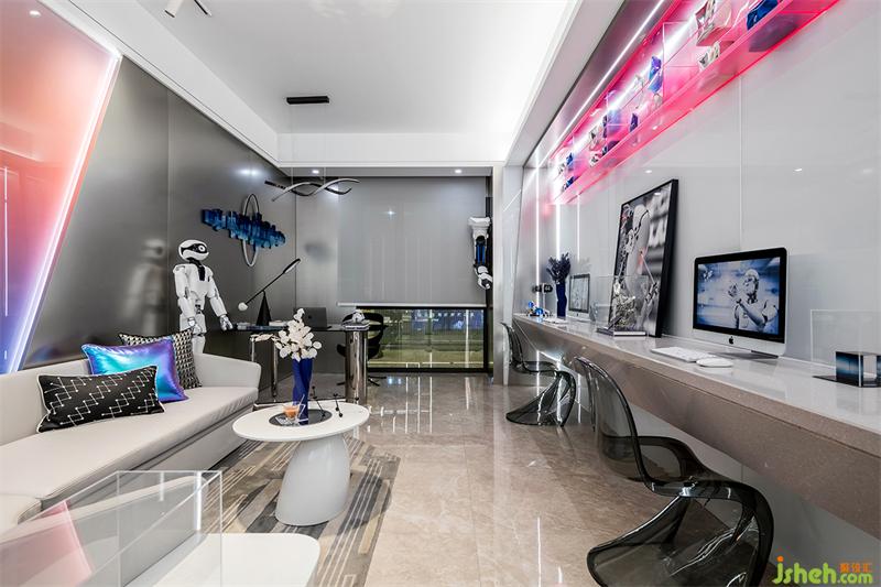 辦公區(qū)配以造型別致的桌椅,打破了空間的單調(diào),展示區(qū)墻面機器手臂掛飾以及大屏電腦配置為來訪者提供互動體驗,感受科技的神秘力量,以此致敬科技的發(fā)展,表達(dá)對科技探索的渴望,引領(lǐng)著人們在舊范式與新空間,未來與現(xiàn)實,虛與實,動與靜中來回穿梭,營造一個年輕,時尚,個性又充滿科技感的辦公空間。