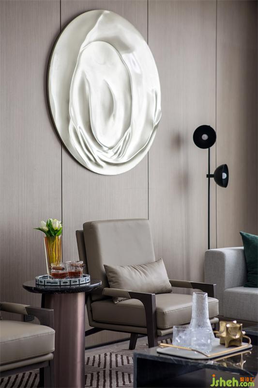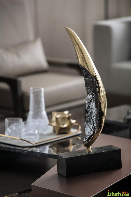超大L型落地窗大客廳讓整個空間豪氣十足,盡情享受城市的天際線,24小時觀賞城市的發(fā)展與變遷。意大利MINATTI轉(zhuǎn)角組合沙發(fā)可以自由切換成會客聚會模式和家人閑坐燈火可親的合家歡模式。象征著與時間賽跑的“時光的腳印”掛飾,笑容可掬的獵豹模型,拍賣會收集的金屬象牙藝術(shù)品,剛剛?cè)计鸬墓虐脱┣眩饺缴鸹鹈绲那度胧诫娮颖跔t,整排存放藝術(shù)收藏品的展示柜,無不展示著主人的審美情趣和對藝術(shù)品投資的熱忱,腹有詩書氣自華的書卷氣與藝術(shù)合二為一。