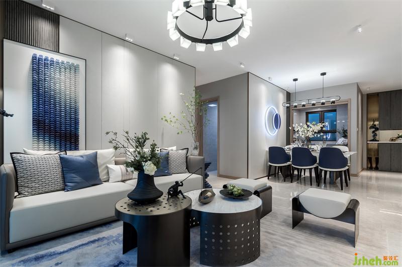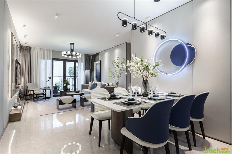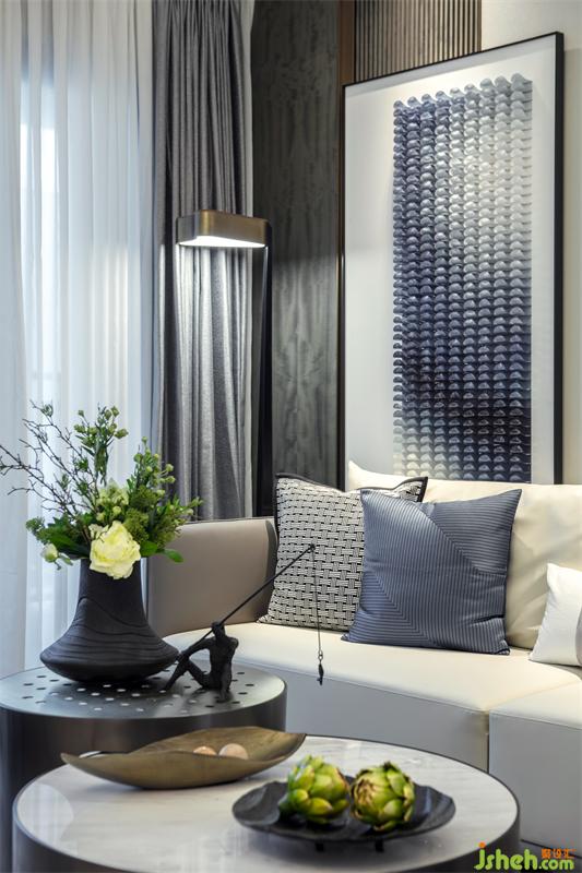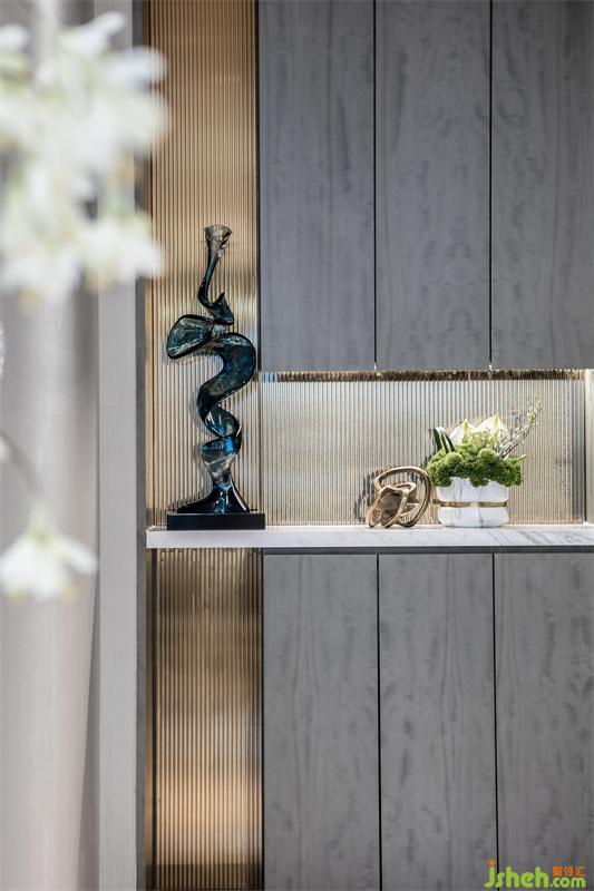 在方正的客廳空間,我們用借景的手法打破對(duì)稱,銅川樣板房設(shè)計(jì)在胡桃木飾面打底的背景墻上懸掛著一幅時(shí)光的印記——用水晶馬賽克演繹的檐角片訴說這座城市的過去,又播放著家的未來。邊幾上屹立的吊鐘將家人的優(yōu)雅姿態(tài)詮釋的栩栩如生?;氐郊蚁慈ネ饷媸澜绲泥须s,與家人閑坐,輕松自如,沒有了拘謹(jǐn)和束縛,釋放身心。我把玩新買的小雕塑,你凝望上次生日收的釋迦果。微風(fēng)襲來,茶幾上的山茶花撒播著沁人心脾的香味,是甜蜜生活最真切的注腳。