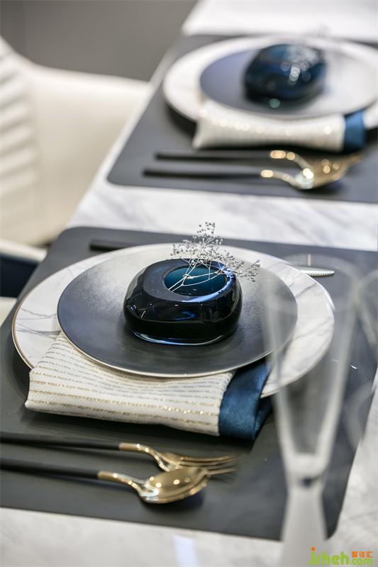 東方文化的骨髓里都在強(qiáng)調(diào)對(duì)稱和儀式感,整齊劃一的餐具,對(duì)稱排列的餐椅,星星陣列的吊燈,在碧城色圓月型壁燈的照耀下,有種圓滿又回歸的悸動(dòng)。女主人精心準(zhǔn)備的姜花顯得格外的典雅和悠揚(yáng),畫面再現(xiàn)“漫空沙氣蜀姜黃,一角高城漏日光”的場(chǎng)景。